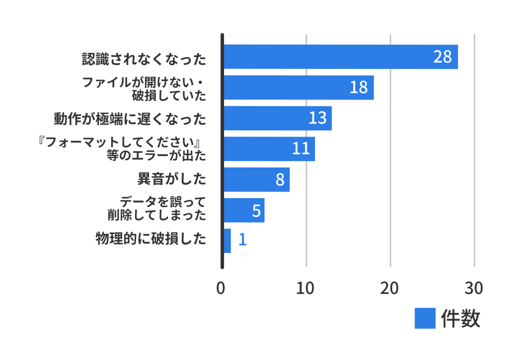初期化を意味する「『フォーマットしてください』等のエラーが出た」11件(25.6%)や「異音がした(カチカチ、カタカタ等)」8件(18.6%)といったケースも見られます。