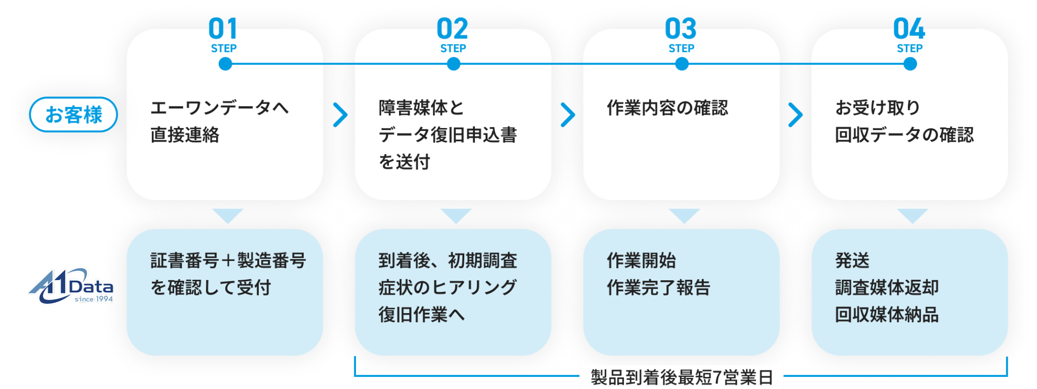 - 復旧に要する期間は、製品到着後7営業日以内となります。ただし物理障害、重度な障害などは、それ以上かかる場合があります。